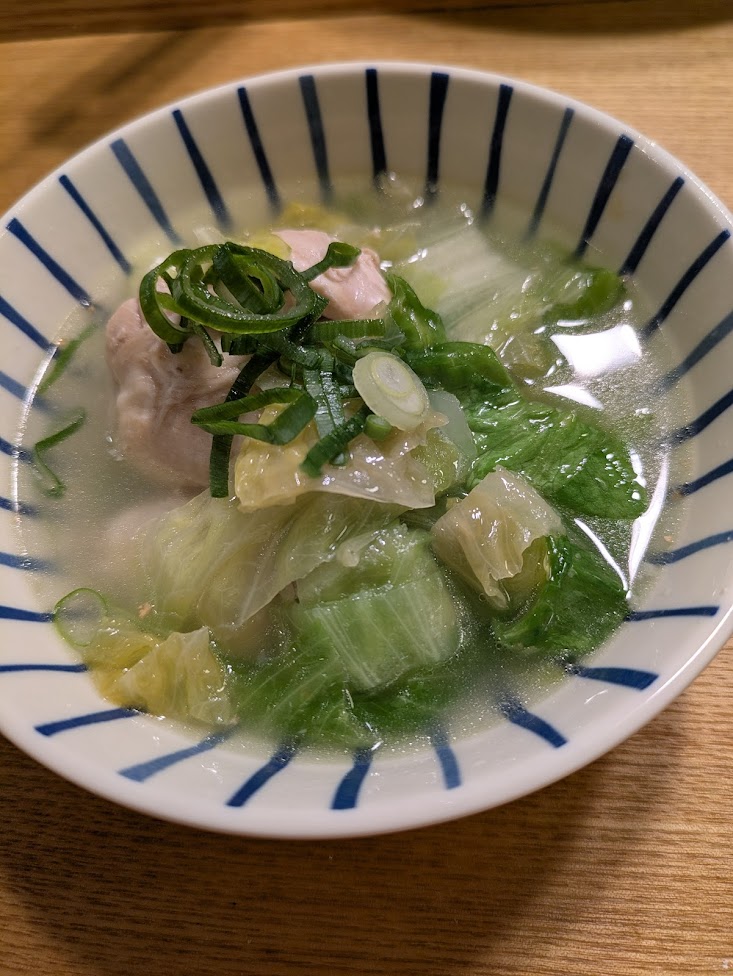 鶏だしのレタススープ。仕上げにねぎを散らしたよ